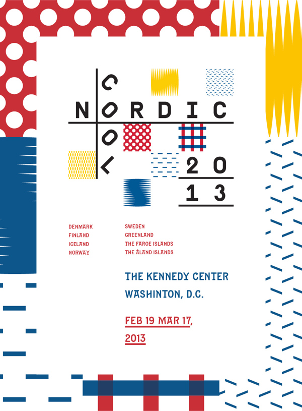 2013年2月,肯尼迪表演艺术中心介绍Nordic Cool ,长达一个月的节日中,专注于多元文化的北欧国家(丹麦,芬兰,冰岛,挪威和瑞典),以及格陵兰、法罗群岛、奥兰群岛的领土上被概念化北欧酷派2013的身份,通过错落有致的图形线索来描绘这个多样和独特的文化区域中的戏剧、舞蹈、音乐、视觉艺术、文学、美食和电影。这些线索源于国家的符号、形式和色彩,设计表现传统和日常生活的文化。Dms