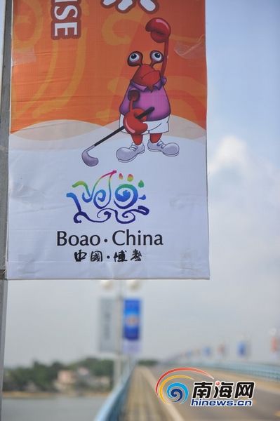 博鳌镇上挂出的宣传标识牌中,已经能看见吉祥物的身影,图为“蟹帮帮”。(南海网记者李庆芳摄)